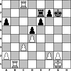 Partie-Notation im PGN-Format [Event "Schach Master"] [Site "www.mySchach.de"] [Date "2004.07.16"] [Round "1"] [White "NoBody"] [Black "Joschi"] [ECO "A48"] [WhitemyELO "1690"] [BlackmyELO "1535"] [Result "1-0"] [TimeControl "10/864000"] [WhiteDays "40"] [BlackDays "38"] [MySchachNr "5702"] 1. d4 Nf6 2. Nf3 g6 3. Bg5 Bg7 4. Nbd2 O-O 5. e3 d6 6. Bd3 Nbd7 7. c3 c5 8. O-O cxd4 9. exd4 b6 10. Re1 Bb7 11. Qe2 e6 12. Nc4 Bxf3 13. Qxf3 d5 14. Ne5 h6 15. Nxd7 hxg5 16. Nxf8 Qxf8 17. Qg3 g4 18. Qf4 a6 19. Be2 b5 20. Bxg4 Nxg4 21. Qxg4 Rc8 22. Re3 Rc4 23. h4 b4 24. h5 bxc3 25. bxc3 gxh5 26. Qxh5 Rc7 27. Rb1 Qc8 28. Rh3 Re7 29. Qh7+ Kf8 30. Qh8+ Bxh8 31. Rxh8+ Kg7 32. Rxc8 1-0 Stellungs-Notation im FEN-Format 2R5/4rpk1/p3p3/3p4/3P4/2P5/P4PP1/1R4K1 - - - 0 32 Geschlagene Figuren Weiss: Geschlagene Figuren Schwarz: Klicken Sie auf eine geschlagene Figur um den gewünschten Zug darzustellen!