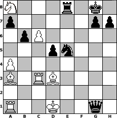 Partie-Notation im PGN-Format [Event "Der Weihnachtsmann kommt bald."] [Site "www.mySchach.de"] [Date "2010.11.05"] [Round "1"] [White "Lemmi11"] [Black "martinus"] [ECO "A06"] [WhitemyELO "1790"] [BlackmyELO "1761"] [Result "0-1"] [TimeControl "10/1728000"] [WhiteDays "80"] [BlackDays "72"] [MySchachNr "69546"] 1. Nf3 d5 2. d4 e6 3. c4 Nf6 4. Nc3 Bb4 5. cxd5 Nxd5 6. Qc2 f5 7. a3 Bxc3+ 8. bxc3 Nc6 9. e3 O-O 10. Bd3 Nf6 11. O-O Qe8 12. a4 Qh5 13. Ba3 Re8 14. c4 b6 15. Rfd1 Bb7 16. d5 Ne7 17. Nd4 exd5 18. c5 Ng4 19. h3 Nh6 20. c6 Bc8 21. Nb5 f4 22. Nxc7 Bxh3 23. gxh3 Qxh3 24. f3 Nef5 25. Qh2 Qxf3 26. Qxf4 Qh3 27. Nxa8 Nh4 28. Rd2 Nf3+ 29. Kf2 Ng4+ 30. Qxg4 Qxg4 31. Rc2 Ne5 32. Rc3 Qf3+ 33. Ke1 Qxe3+ 34. Kd1 Qg1+ 0-1 Stellungs-Notation im FEN-Format N3r1k1/p5pp/1pP5/3pn3/P7/B1RB4/8/R2K2q1 - - - 2 35 Geschlagene Figuren Weiss: Geschlagene Figuren Schwarz: Klicken Sie auf eine geschlagene Figur um den gewünschten Zug darzustellen!