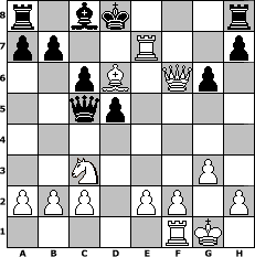 Partie-Notation im PGN-Format [Event "Camelot Tournament"] [Site "www.mySchach.de"] [Date "2006.11.19"] [Round "1"] [White "Nightflight"] [Black "OwainGwynedd"] [ECO "C50"] [WhitemyELO "1560"] [BlackmyELO "1519"] [Result "1-0"] [TimeControl "10/3456000"] [WhiteDays "46"] [BlackDays "80"] [MySchachNr "30242"] 1. e4 e5 2. Nf3 Nc6 3. Bc4 Nh6 4. d4 Qf6 5. Nxe5 Nxe5 6. dxe5 Qxe5 7. O-O Bd6 8. g3 Ng8 9. Nc3 c6 10. Bf4 Qc5 11. Bxf7+ Ke7 12. e5 Bxe5 13. Bxe5 Kxf7 14. Qh5+ g6 15. Qf3+ Ke8 16. Rae1 d5 17. Bd6+ Ne7 18. Rxe7+ Kd8 19. Qf6 1-0 Stellungs-Notation im FEN-Format r1bk3r/pp2R2p/2pB1Qp1/2qp4/8/2N3P1/PPP1PP1P/5RK1 - - - 2 19 Geschlagene Figuren Weiss: ![]() ![]() ![]() ![]() ![]() ![]() ![]() ![]() ![]() ![]() ![]() ![]() ![]() ![]() ![]() Geschlagene Figuren Schwarz: ![]() ![]() ![]() ![]() ![]() ![]() ![]() ![]() ![]() ![]() ![]() ![]() ![]() ![]() ![]() Klicken Sie auf eine geschlagene Figur um den gewünschten Zug darzustellen!