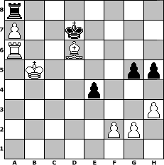 Partie-Notation im PGN-Format [Event "Abermals Aljechin"] [Site "www.mySchach.de"] [Date "2011.02.13"] [Round "2"] [White "Joschi"] [Black "Schefsche"] [ECO "A52"] [WhitemyELO "1447"] [BlackmyELO "1361"] [Result "1-0"] [TimeControl "10/1728000"] [WhiteDays "62"] [BlackDays "47"] [MySchachNr "71997"] 1. d4 Nf6 2. c4 e5 3. dxe5 Ng4 4. e4 d6 5. exd6 Qxd6 6. Qxd6 Bxd6 7. h3 Ne5 8. Be2 O-O 9. Nf3 Nbc6 10. Nc3 Bb4 11. Bd2 Bxc3 12. Bxc3 Nxf3+ 13. Bxf3 Be6 14. b3 b6 15. O-O-O a5 16. e5 a4 17. Bxc6 Ra7 18. Bxa4 Bxc4 19. bxc4 Rxa4 20. Kb2 Rxc4 21. Kb3 b5 22. Rd4 Rxd4 23. Bxd4 c6 24. Bc5 Rd8 25. Bd6 f6 26. Rc1 fxe5 27. Rxc6 e4 28. Kb4 Kf7 29. Kxb5 g5 30. a4 h5 31. a5 Ke8 32. a6 Kd7 33. a7 Ra8 34. Ra6 1-0 Stellungs-Notation im FEN-Format r7/P2k4/R2B4/1K4pp/4p3/7P/5PP1/8 - - - 2 34 Geschlagene Figuren Weiss: Geschlagene Figuren Schwarz: Klicken Sie auf eine geschlagene Figur um den gewünschten Zug darzustellen!