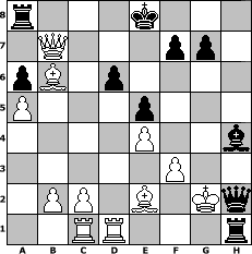 Partie-Notation im PGN-Format [Event "Ja, is denn heut scho Weihnachten?"] [Site "www.mySchach.de"] [Date "2014.12.06"] [Round "1"] [White "Joschi"] [Black "Winston"] [ECO "B28"] [WhitemyELO "1604"] [BlackmyELO "1494"] [Result "0-1"] [TimeControl "10/2592000"] [WhiteDays "90"] [BlackDays "89"] [MySchachNr "97047"] 1. e4 c5 2. Nf3 a6 3. d4 cxd4 4. Nxd4 d6 5. Nc3 e5 6. Nf3 h6 7. Be2 Nf6 8. O-O Be7 9. h3 Be6 10. Be3 Nbd7 11. a4 Nh7 12. a5 Ng5 13. Nxg5 hxg5 14. Qd2 Nf8 15. Bb6 Qc8 16. Qe3 Ng6 17. Rac1 Nf4 18. Rfd1 Bxh3 19. gxh3 Rxh3 20. Qd2 Qe6 21. Nd5 Nxd5 22. Qxd5 Qh6 23. f3 g4 24. Qxb7 Rh1+ 25. Kf2 g3+ 26. Kxg3 Qf4+ 27. Kf2 Bh4+ 28. Kg2 Qh2# 0-1 Stellungs-Notation im FEN-Format r3k3/1Q3pp1/pB1p4/P3p3/4P2b/5P2/1PP1B1Kq/2RR3r - q - 5 29 Geschlagene Figuren Weiss: Geschlagene Figuren Schwarz: Klicken Sie auf eine geschlagene Figur um den gewünschten Zug darzustellen!