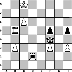 Partie-Notation im PGN-Format [Event "Wargames-kill the King II"] [Site "www.mySchach.de"] [Date "2005.11.18"] [Round "2"] [White "Baehr008"] [Black "bopl"] [ECO "B07"] [WhitemyELO "1979"] [BlackmyELO "1502"] [Result "1-0"] [TimeControl "10/864000"] [WhiteDays "09"] [BlackDays "10"] [MySchachNr "19806"] 1. e4 d6 2. d4 Nf6 3. Nc3 c6 4. Nf3 Bg4 5. h3 Bxf3 6. Qxf3 Qb6 7. e5 Nfd7 8. exd6 Qxd4 9. Nb5 Qe5+ 10. Be3 Na6 11. O-O-O Qf6 12. Qe4 Qe5 13. Qxe5 Nxe5 14. Nd4 Nb4 15. dxe7 Bxe7 16. Nf5 Nd5 17. Nxg7+ Kf8 18. Bh6 Bg5+ 19. Bxg5 Kxg7 20. c4 Nf6 21. Be2 Rhe8 22. Rhe1 b6 23. f4 Ne4 24. fxe5 Nxg5 25. Bf3 Re6 26. Rd7 Rae8 27. Rxa7 Nxf3 28. gxf3 Rxe5 29. Rxe5 Rxe5 30. Rc7 Re6 31. Kd2 Rd6+ 32. Ke3 Kg6 33. c5 Re6+ 34. Kd4 b5 35. b3 h5 36. Rd7 Re2 37. Rd6+ Kg5 38. Rxc6 Rd2+ 39. Ke5 Re2+ 40. Kd6 f5 41. Rb6 Rxa2 42. c6 Rd2+ 43. Ke6 Re2+ 44. Kd7 Rd2+ 45. Kc8 Kf4 46. Rxb5 1-0 Stellungs-Notation im FEN-Format 2K5/8/2P5/1R3p1p/5k2/1P3P1P/3r4/8 - - - 0 46 Geschlagene Figuren Weiss: Geschlagene Figuren Schwarz: Klicken Sie auf eine geschlagene Figur um den gewünschten Zug darzustellen!