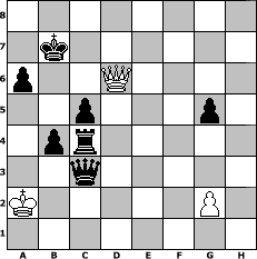 Partie-Notation im PGN-Format [Event "Aljechin zu Mittag"] [Site "www.mySchach.de"] [Date "2006.04.18"] [Round "1"] [White "Caligula"] [Black "Seneca"] [ECO "A83"] [WhitemyELO "1540"] [BlackmyELO "1847"] [Result "1/2-1/2"] [TimeControl "10/1728000"] [WhiteDays "20"] [BlackDays "20"] [MySchachNr "24645"] 1. d4 f5 2. e4 fxe4 3. Nc3 Nf6 4. Bg5 g6 5. h4 d5 6. Be2 Nc6 7. h5 Rg8 8. Bxf6 exf6 9. hxg6 hxg6 10. Qd2 Be6 11. O-O-O Qd7 12. f3 f5 13. fxe4 fxe4 14. a3 O-O-O 15. Bb5 a6 16. Bxc6 Qxc6 17. Nge2 Bg4 18. Rde1 Be7 19. Qf4 Bxe2 20. Rxe2 Bxa3 21. Nxd5 Bxb2+ 22. Kxb2 Qxd5 23. Rxe4 Qb5+ 24. Kc1 Qa4 25. Kd2 Rd5 26. Rhe1 c5 27. Qg4+ Qd7 28. Re8+ Rxe8 29. Rxe8+ Kc7 30. Qg3+ Kb6 31. Re3 Rxd4+ 32. Kc1 Qf7 33. Rf3 Qe6 34. Ra3 Qd6 35. Rb3+ Ka7 36. Qf3 b5 37. c3 Rf4 38. Qe3 Rf1+ 39. Kb2 Rd1 40. Kc2 g5 41. Qe2 Rd5 42. Rb1 Kb6 43. c4 Re5 44. Qf1 b4 45. Rd1 Qe7 46. Rd2 Re3 47. Qd1 Rc3+ 48. Kb2 Rxc4 49. Rd6+ Kb5 50. Qd3 Qe5+ 51. Ka2 Qc3 52. Rb6+ Kxb6 53. Qd6+ Kb7 1/2-1/2 Stellungs-Notation im FEN-Format 8/1k6/p2Q4/2p3p1/1pr5/2q5/K5P1/8 - - - 2 54 Geschlagene Figuren Weiss: Geschlagene Figuren Schwarz: Klicken Sie auf eine geschlagene Figur um den gewünschten Zug darzustellen!