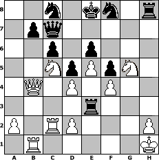 Partie-Notation im PGN-Format [Event "Vor dem Urlaub noch ein schnelles Turnier!"] [Site "www.mySchach.de"] [Date "2012.06.16"] [Round "1"] [White "ElisabethPeters"] [Black "grazy"] [ECO "A45"] [WhitemyELO "1572"] [BlackmyELO "1574"] [Result "1-0"] [TimeControl "10/864000"] [WhiteDays "10"] [BlackDays "10"] [MySchachNr "82238"] 1. d4 Nf6 2. Nc3 d5 3. Bf4 Bf5 4. e3 e6 5. Bd3 Bxd3 6. cxd3 Bd6 7. Be5 O-O 8. Rc1 Bxe5 9. dxe5 Nfd7 10. f4 Qh4+ 11. g3 Qe7 12. Nf3 a6 13. d4 Nc6 14. O-O Nb6 15. Qe2 h6 16. Ne1 Qd7 17. Nd3 Ne7 18. g4 Rae8 19. b3 c6 20. Qf3 Qc7 21. Ne2 f5 22. g5 Kf7 23. gxh6 Rh8 24. hxg7 Kxg7 25. Kh1 Rh6 26. Ng1 Reh8 27. Qg2+ Kf8 28. Nf3 Nd7 29. Qb2 Ke8 30. Rc2 Nf8 31. Rg1 a5 32. b4 axb4 33. Qxb4 Nc8 34. Rb1 Rh3 35. Ng5 Rxe3 36. Nc5 1-0 Stellungs-Notation im FEN-Format 2n1kn1r/1pq5/2p1p3/2NpPpN1/1Q1P1P2/4r3/P1RP3P/1R5K - - - 1 36 Geschlagene Figuren Weiss: Geschlagene Figuren Schwarz: Klicken Sie auf eine geschlagene Figur um den gewünschten Zug darzustellen!