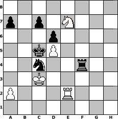 Partie-Notation im PGN-Format [Event "1.FC 960-Clubturnier 2012"] [Site "www.mySchach.de"] [Date "2012.01.07"] [Round "1"] [White "neoprogtroll"] [Black "Erich"] [Variant "Fischerrandom"] [SetUp "1"] [FEN "nrbnkbrq/pppppppp/8/8/8/8/PPPPPPPP/NRBNKBRQ w KQkq - 0 1"] [WhitemyELO "1656"] [BlackmyELO "2006"] [Result "0-1"] [TimeControl "10/2592000"] [WhiteDays "28"] [BlackDays "30"] [MySchachNr "79005"] 1. e4 g6 2. Nb3 Nc6 3. c3 f5 4. g3 fxe4 5. Qxe4 Nb6 6. d4 d6 7. Ne3 e5 8. Bb5 Bd7 9. d5 Ne7 10. Bxd7+ Nxd7 11. O-O Bh6 12. Ng4 Bxc1 13. Rbxc1 h5 14. Ne3 h4 15. Rc2 Rf8 16. f4 hxg3 17. hxg3 Qh3 18. Qg2 Qxg2+ 19. Rxg2 exf4 20. gxf4 O-O-O 21. Nd4 Rh8 22. f5 gxf5 23. Ndxf5 Nxf5 24. Nxf5 Rh7 25. b3 b5 26. Rf3 Nb6 27. Ne3 Re8 28. c4 bxc4 29. bxc4 Rhe7 30. Kf2 Nd7 31. Ke2 Ne5 32. Nf5 Rf7 33. Rf1 Nxc4+ 34. Kd3 Ne5+ 35. Kc3 Ref8 36. Ne7+ Kb7 37. Rxf7 Rxf7 38. Ng8 Rf4 39. Rb2+ Ka6 40. Ne7 Rf7 41. Ng8 Rf3+ 42. Kd4 Rf4+ 43. Kc3 Nc4 44. Re2 Kb6 45. Ne7 Kc5 0-1 Stellungs-Notation im FEN-Format 8/p1p1N3/3p4/2kP4/2n2r2/2K5/P3R3/8 - - - 16 46 Geschlagene Figuren Weiss: Geschlagene Figuren Schwarz: Klicken Sie auf eine geschlagene Figur um den gewünschten Zug darzustellen!