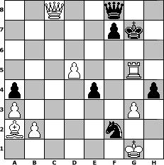 Partie-Notation im PGN-Format [Event "1. Weltmeisterschaft @ myschach.de"] [Site "www.mySchach.de"] [Date "2006.09.15"] [Round "1"] [White "ujack1961"] [Black "bane"] [ECO "B01"] [WhitemyELO "1774"] [BlackmyELO "1933"] [Result "1-0"] [TimeControl "10/2592000"] [WhiteDays "180"] [BlackDays "176"] [MySchachNr "28488"] 1. e4 d5 2. exd5 Qxd5 3. Nc3 Qd8 4. Bc4 Nf6 5. d4 Nbd7 6. Nf3 e6 7. Bf4 Bd6 8. Qd2 Nb6 9. Bb3 O-O 10. O-O a5 11. a3 a4 12. Ba2 Ra5 13. Bxd6 cxd6 14. Ne4 Rb5 15. Nxf6+ Qxf6 16. c4 Rf5 17. Rfe1 Rd8 18. Qb4 Rxf3 19. gxf3 Qg6+ 20. Kh1 Nd7 21. Qxd6 Qf6 22. d5 Qxf3+ 23. Kg1 e5 24. Re3 Qg4+ 25. Rg3 Qh4 26. Rd1 b6 27. Qb4 e4 28. Re1 Ne5 29. c5 Bf5 30. cxb6 Qf4 31. Ree3 Nd3 32. Qd2 Qd6 33. Qc3 g6 34. Qc7 h5 35. Re2 Rd7 36. Qc6 Nf4 37. Re1 h4 38. Rc3 Qe7 39. Kh1 Bh3 40. Rg1 Nd3 41. Rxg6+ Kh7 42. Rh6+ Kg7 43. Rh5 Nxf2+ 44. Kg1 Rd6 45. b7 Rxc6 46. b8=Q Rg6+ 47. Rg3 Rxg3+ 48. hxg3 Bc8 49. Qxc8 Qf8 50. Rg5+ 1-0 Stellungs-Notation im FEN-Format 2Q2q2/5pk1/8/3P2R1/p3p2p/P5P1/BP3n2/6K1 - - - 2 50 Geschlagene Figuren Weiss: ![]() ![]() ![]() ![]() ![]() ![]() ![]() ![]() ![]() ![]() ![]() ![]() ![]() ![]() ![]() Geschlagene Figuren Schwarz: ![]() ![]() ![]() ![]() ![]() ![]() ![]() ![]() ![]() ![]() ![]() ![]() ![]() ![]() ![]() Klicken Sie auf eine geschlagene Figur um den gewünschten Zug darzustellen!