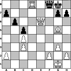 Partie-Notation im PGN-Format [Event "9er10"] [Site "www.mySchach.de"] [Date "2025.11.20"] [Round "1"] [White "Winston"] [Black "Lohl"] [ECO "B01"] [WhitemyELO "1505"] [BlackmyELO "1279"] [Result "1-0"] [TimeControl "10/3456000"] [WhiteDays "40"] [BlackDays "40"] [MySchachNr "133956"] 1. e4 d5 2. exd5 Nf6 3. Bb5+ Bd7 4. Bxd7+ Nbxd7 5. c4 e6 6. Qe2 Bc5 7. dxe6 fxe6 8. Qxe6+ Be7 9. Nf3 Nc5 10. Qe2 O-O 11. O-O Re8 12. d4 Bd6 13. Qc2 Nce4 14. Be3 b6 15. Nc3 Nxc3 16. bxc3 Ne4 17. Rad1 c5 18. Ne5 Bxe5 19. dxe5 Qh4 20. g3 Qe7 21. Qxe4 Qc7 22. Bf4 Qf7 23. Rd6 Rac8 24. Rfd1 Qf8 25. e6 Rc7 26. Bg5 Rf7 27. exf7+ Qxf7 28. Rd8 Rxd8 29. Rxd8+ Qf8 30. Qe6+ 1-0 Stellungs-Notation im FEN-Format 3R1qk1/p5pp/1p2Q3/2p3B1/2P5/2P3P1/P4P1P/6K1 - - - 2 30 Geschlagene Figuren Weiss: Geschlagene Figuren Schwarz: Klicken Sie auf eine geschlagene Figur um den gewünschten Zug darzustellen!