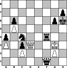 Partie-Notation im PGN-Format [Event "Knight Moves"] [Site "www.mySchach.de"] [Date "2005.05.20"] [Round "1"] [White "Gno"] [Black "Knight"] [ECO "A00"] [WhitemyELO "1283"] [BlackmyELO "1237"] [Result "0-1"] [TimeControl "10/2592000"] [WhiteDays "150"] [BlackDays "150"] [MySchachNr "13229"] 1. e3 e5 2. b3 d5 3. Be2 Nf6 4. Nc3 Nc6 5. Nf3 g6 6. h3 Bg7 7. d3 O-O 8. O-O d4 9. Ne4 Nxe4 10. dxe4 Be6 11. Bb2 a5 12. a3 a4 13. b4 f5 14. Qd3 f4 15. Rae1 fxe3 16. fxe3 Bh6 17. Kh1 Bxe3 18. b5 Na5 19. Nxe5 Rxf1+ 20. Rxf1 Qd6 21. Nf3 Bc4 22. Qd1 Rf8 23. Re1 Bxe2 24. Qxe2 c5 25. Bc3 dxc3 26. Qxe3 Qf6 27. Qxc5 b6 28. Qc7 Rd8 29. Rf1 Re8 30. h4 Rxe4 31. Kg1 Nc4 32. Ng5 Qd4+ 33. Kh2 Rxh4+ 34. Kg3 Qg4+ 35. Kf2 Qxg5 36. Qc8+ Kg7 37. Qd7+ Kh6 38. Qd3 Qf4+ 39. Ke1 Qc1+ 40. Kf2 Rf4+ 41. Kg3 Qxf1 0-1 Stellungs-Notation im FEN-Format 8/7p/1p4pk/1P6/p1n2r2/P1pQ2K1/2P3P1/5q2 - - - 0 42 Geschlagene Figuren Weiss: Geschlagene Figuren Schwarz: Klicken Sie auf eine geschlagene Figur um den gewünschten Zug darzustellen!