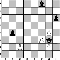 Partie-Notation im PGN-Format [Event "Mannschaftsturnier der letzen Mohikan3er"] [Site "www.mySchach.de"] [Date "2018.06.01"] [Round "1"] [White "wolni55"] [Black "Rotstift10"] [ECO "C23"] [WhitemyELO "1405"] [BlackmyELO "1623"] [Result "0-1"] [TimeControl "10/2592000"] [WhiteDays "122"] [BlackDays "140"] [MySchachNr "112330"] 1. e4 e5 2. Bc4 Nc6 3. Nf3 h6 4. a3 Nf6 5. d3 d5 6. exd5 Nxd5 7. O-O Bg4 8. h3 Bh5 9. Re1 Bxf3 10. Qxf3 Nf6 11. Nc3 Bd6 12. Be3 O-O 13. b4 Nd4 14. Bxd4 exd4 15. Ne4 c6 16. Nxf6+ Qxf6 17. Qxf6 gxf6 18. Re4 f5 19. Re2 Rfe8 20. Ree1 f4 21. Re4 Rxe4 22. dxe4 Be5 23. Rd1 b5 24. Bb3 a5 25. Kf1 axb4 26. axb4 Kg7 27. Ke2 Kg6 28. Kf3 f5 29. exf5+ Kxf5 30. Bf7 Ra4 31. Be8 Rxb4 32. Bxc6 Kg5 33. Ke4 Bg7 34. Rd3 Rb2 35. Rf3 Rxc2 36. Rxf4 Rxc6 37. Rg4+ Kf6 38. Kxd4 Rc4+ 39. Kd3 Rxg4 40. hxg4 Kg5 41. f3 b4 42. Kc2 Kf4 43. Kb3 Bf8 44. Kc2 Kg3 0-1 Stellungs-Notation im FEN-Format 5b2/8/7p/8/1p4P1/5Pk1/2K3P1/8 - - - 6 45 Geschlagene Figuren Weiss: Geschlagene Figuren Schwarz: Klicken Sie auf eine geschlagene Figur um den gewünschten Zug darzustellen!