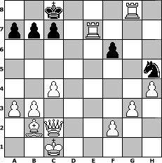Partie-Notation im PGN-Format [Event "Energiekrise"] [Site "www.mySchach.de"] [Date "2022.10.29"] [Round "1"] [White "Hobbykegler"] [Black "Lohl"] [ECO "A20"] [WhitemyELO "1144"] [BlackmyELO "1388"] [Result "1-0"] [TimeControl "10/1728000"] [WhiteDays "20"] [BlackDays "20"] [MySchachNr "127790"] 1. c4 e5 2. b3 Nf6 3. Bb2 Nc6 4. a3 d5 5. cxd5 Nxd5 6. Nc3 Be7 7. Qc2 Be6 8. O-O-O Qd7 9. Nf3 Bf5 10. e4 Nd4 11. Nxd4 exd4 12. exf5 dxc3 13. dxc3 O-O-O 14. c4 Nf4 15. Rxd7 Rxd7 16. g3 Nh5 17. h4 Re8 18. Bh3 f6 19. Re1 g6 20. fxg6 Red8 21. Bxd7+ Rxd7 22. gxh7 Rd8 23. Rxe7 Rg8 24. hxg8=Q# 1-0 Stellungs-Notation im FEN-Format 2k3R1/ppp1R3/5p2/7n/2P4P/PP4P1/1BQ2P2/2K5 - - - 0 24 Geschlagene Figuren Weiss: Geschlagene Figuren Schwarz: Klicken Sie auf eine geschlagene Figur um den gewünschten Zug darzustellen!