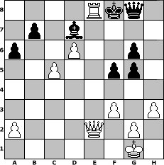 Partie-Notation im PGN-Format [Event "Schinderhannes-Cup"] [Site "www.mySchach.de"] [Date "2011.05.10"] [Round "1"] [Board "3"] [White "reisinger"] [Black "Seneca"] [ECO "A42"] [WhitemyELO "1539"] [BlackmyELO "1488"] [Result "1-0"] [TimeControl "10/2592000"] [WhiteDays "120"] [BlackDays "102"] [MySchachNr "73843"] 1. d4 d6 2. c4 Nf6 3. Nc3 g6 4. Nf3 Bg7 5. Bf4 O-O 6. e4 Nc6 7. d5 Nb8 8. Qd2 c6 9. h3 Nbd7 10. Bd3 Nc5 11. O-O Nxd3 12. Qxd3 cxd5 13. exd5 a6 14. Rfe1 Nd7 15. Qe3 Nc5 16. b4 Nd7 17. Rac1 Bf6 18. Bg5 Ne5 19. Bxf6 exf6 20. Ne4 Re8 21. Nxe5 fxe5 22. Qh6 f5 23. Ng5 Qd7 24. Rc3 Qg7 25. Qh4 Bd7 26. f3 Rac8 27. c5 dxc5 28. bxc5 Re7 29. d6 Ree8 30. Qc4+ Kf8 31. Rce3 h6 32. Rxe5 hxg5 33. Re7 Rxe7 34. Rxe7 Qg8 35. Qe2 Re8 36. Rxe8+ 1-0 Stellungs-Notation im FEN-Format 4Rkq1/1p1b4/p2P2p1/2P2pp1/8/5P1P/P3Q1P1/6K1 - - - 0 36 Geschlagene Figuren Weiss: Geschlagene Figuren Schwarz: Klicken Sie auf eine geschlagene Figur um den gewünschten Zug darzustellen!
