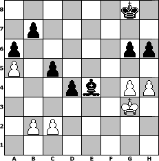 Partie-Notation im PGN-Format [Event "2. Raubzug der Wikinger"] [Site "www.mySchach.de"] [Date "2010.09.14"] [Round "1"] [White "Schefsche"] [Black "leitsgeheier"] [ECO "B20"] [WhitemyELO "1433"] [BlackmyELO "1608"] [Result "0-1"] [TimeControl "10/2592000"] [WhiteDays "116"] [BlackDays "097"] [MySchachNr "68349"] 1. e4 c5 2. Bc4 d6 3. d3 Nf6 4. Nf3 g6 5. Ng5 e6 6. Nc3 Bg7 7. O-O O-O 8. h3 Nc6 9. Bd2 a6 10. a3 d5 11. exd5 exd5 12. Bb3 h6 13. Nf3 Be6 14. Qc1 Kh7 15. a4 Qd7 16. a5 Rfe8 17. Ba4 d4 18. Ne5 Qc7 19. Bf4 Nh5 20. Ne2 Nxf4 21. Qxf4 Bxe5 22. Qf3 Rec8 23. Bxc6 Qxc6 24. Qxc6 Rxc6 25. f4 Bg7 26. g4 Re8 27. Ng3 Bd7 28. Rae1 Rce6 29. Rxe6 Rxe6 30. f5 Re3 31. fxg6+ fxg6 32. Kf2 Bc6 33. h4 Rf3+ 34. Kg2 Rxd3+ 35. Kh3 Re3 36. Rf7 Kg8 37. Rf1 Be5 38. Rg1 Rxg3+ 39. Rxg3 Bxg3 40. Kxg3 Be4 0-1 Stellungs-Notation im FEN-Format 6k1/1p6/p5pp/P1p5/3pb1PP/6K1/1PP5/8 - - - 1 41 Geschlagene Figuren Weiss: Geschlagene Figuren Schwarz: Klicken Sie auf eine geschlagene Figur um den gewünschten Zug darzustellen!