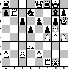 Partie-Notation im PGN-Format [Event "Albspiele 20"] [Site "www.mySchach.de"] [Date "2012.05.01"] [Round "1"] [White "Steppenwolf"] [Black "Knight"] [ECO "B15"] [WhitemyELO "1142"] [BlackmyELO "1218"] [Result "0-1"] [TimeControl "10/1728000"] [WhiteDays "20"] [BlackDays "20"] [MySchachNr "81538"] 1. e4 c6 2. d4 d5 3. Nc3 Nf6 4. e5 Ne4 5. Nf3 Bg4 6. Bf4 Nxc3 7. bxc3 e6 8. Bd3 Nd7 9. O-O Ba3 10. h3 Bxf3 11. Qxf3 Bb2 12. Rab1 Bxc3 13. Rxb7 O-O 14. Qh5 g6 15. Qh6 f5 16. Bg5 Qe8 17. g4 Bxd4 18. h4 Bxe5 19. f4 Bg7 0-1 Stellungs-Notation im FEN-Format r3qrk1/pR1n2bp/2p1p1pQ/3p1pB1/5PPP/3B4/P1P1P3/5RK1 - - - 1 20 Geschlagene Figuren Weiss: Geschlagene Figuren Schwarz: Klicken Sie auf eine geschlagene Figur um den gewünschten Zug darzustellen!