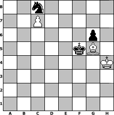 Partie-Notation im PGN-Format [Event "unter uns Nr. 53 (Sommeranfang)"] [Site "www.mySchach.de"] [Date "2022.06.22"] [Round "1"] [White "beowulf"] [Black "boeserWatz"] [ECO "A03"] [WhitemyELO "1464"] [BlackmyELO "1305"] [Result "1/2-1/2"] [TimeControl "10/864000"] [WhiteDays "80"] [BlackDays "43"] [MySchachNr "126125"] 1. f4 d5 2. Nf3 e6 3. e3 Bd7 4. Nc3 Bb4 5. Be2 Nf6 6. O-O O-O 7. d4 Bxc3 8. bxc3 Ne4 9. Ba3 Re8 10. Nd2 Nxc3 11. Qe1 Ba4 12. Nb3 Nxe2+ 13. Qxe2 Bxb3 14. axb3 Nc6 15. c4 dxc4 16. bxc4 Na5 17. Rfb1 b6 18. Bb4 Nc6 19. Bc3 a5 20. Qg4 g6 21. Rd1 Qf6 22. Rac1 Ne7 23. d5 Qf5 24. Qxf5 Nxf5 25. e4 Ne3 26. Rd4 Rad8 27. Kf2 Ng4+ 28. Kg3 Nf6 29. e5 Nh5+ 30. Kf3 Ng7 31. g4 h5 32. h3 Re7 33. d6 cxd6 34. exd6 Red7 35. Rcd1 Ne8 36. R4d3 Rxd6 37. Ke3 Kf8 38. Be5 Rxd3+ 39. Rxd3 Rxd3+ 40. Kxd3 f6 41. Bd4 a4 42. Bxb6 Kf7 43. c5 a3 44. Kc3 f5 45. g5 e5 46. fxe5 Ke6 47. Kb3 f4 48. Kxa3 Kxe5 49. Kb4 Kf5 50. c6 f3 51. h4 Kg4 52. Bf2 Kh3 53. Kc3 Kg2 54. Bb6 Kg3 55. Kd3 f2 56. Ke2 Kxh4 57. Be3 Kg4 58. Kxf2 h4 59. Kg2 Nd6 60. c7 Nc8 61. Kh2 h3 62. Bd2 Nd6 63. Bb4 Nc8 64. Bc5 Kh4 65. Bf2+ Kg4 66. Bg3 Nb6 67. Bf2 Nc8 68. Bc5 Kh4 69. Bf2+ Kg4 70. Bg3 Nb6 71. Be5 Kf5 72. Bd4 Nc8 73. Kxh3 Kxg5 74. Be3+ Kf5 75. Kh4 Ne7 76. Bg5 Nc8 1/2-1/2 Stellungs-Notation im FEN-Format 2n5/2P5/6p1/5kB1/7K/8/8/8 - - - 6 77 Geschlagene Figuren Weiss: Geschlagene Figuren Schwarz: Klicken Sie auf eine geschlagene Figur um den gewünschten Zug darzustellen!