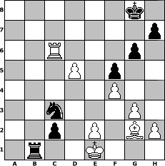 Partie-Notation im PGN-Format [Event "5erd2"] [Site "www.mySchach.de"] [Date "2017.01.17"] [Round "2"] [White "deepsabel"] [Black "espero"] [ECO "A46"] [WhitemyELO "1949"] [BlackmyELO "1854"] [Result "0-1"] [TimeControl "10/2592000"] [WhiteDays "109"] [BlackDays "092"] [MySchachNr "106523"] 1. d4 Nf6 2. Nf3 c5 3. d5 e6 4. c4 exd5 5. cxd5 d6 6. Nc3 g6 7. g3 Bg7 8. Bg2 O-O 9. O-O Re8 10. Nd2 a6 11. a4 Nbd7 12. Nc4 Nb6 13. Na3 Bd7 14. a5 Nc8 15. Nc4 Bb5 16. Qb3 Bxc4 17. Qxc4 b5 18. axb6 Nxb6 19. Qh4 Nfd7 20. Qxd8 Rexd8 21. Bf4 Be5 22. Bxe5 Nxe5 23. b3 a5 24. Na4 Nxa4 25. Rxa4 Rdb8 26. Rfa1 Rxb3 27. f4 Nd7 28. Rxa5 Rxa5 29. Rxa5 c4 30. Ra4 c3 31. Kf2 f5 32. Rc4 Nb6 33. Rc7 Na4 34. Rc4 Nb2 35. Rc6 Nd1+ 36. Ke1 Rb1 37. Rxd6 c2 38. Rc6 Nc3+ 0-1 Stellungs-Notation im FEN-Format 6k1/7p/2R3p1/3P1p2/5P2/2n3P1/2p1P1BP/1r2K3 - - - 2 39 Geschlagene Figuren Weiss: ![]() ![]() ![]() ![]() ![]() ![]() ![]() ![]() ![]() ![]() ![]() ![]() ![]() ![]() ![]() Geschlagene Figuren Schwarz: ![]() ![]() ![]() ![]() ![]() ![]() ![]() ![]() ![]() ![]() ![]() ![]() ![]() ![]() ![]() Klicken Sie auf eine geschlagene Figur um den gewünschten Zug darzustellen!