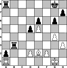 Partie-Notation im PGN-Format [Event "Verschachert #2"] [Site "www.mySchach.de"] [Date "2012.11.04"] [Round "2"] [White "Knight"] [Black "reisender"] [ECO "D20"] [WhitemyELO "1211"] [BlackmyELO "1350"] [Result "0-1"] [TimeControl "10/864000"] [WhiteDays "40"] [BlackDays "40"] [MySchachNr "84874"] 1. d4 d5 2. c4 dxc4 3. Nc3 Be6 4. e4 c6 5. Nf3 g6 6. e5 Nh6 7. Be2 Bg7 8. O-O O-O 9. Re1 Bg4 10. h3 Be6 11. b3 cxb3 12. axb3 Qd7 13. Ba3 b5 14. b4 a5 15. Bb2 a4 16. Ra3 Na6 17. Na2 Bb3 18. Qd3 Bxa2 19. Rxa2 Nxb4 20. Qb1 Nxa2 21. Qxa2 Nf5 22. g4 Nh6 23. Bc1 e6 24. Bf1 f6 25. Bxh6 Bxh6 26. Bd3 fxe5 27. Nxe5 Qd5 28. Qxd5 cxd5 29. Nd7 Rf3 30. Bxb5 a3 31. Ra1 Bg7 32. Ne5 Bxe5 33. dxe5 Rb3 34. Be2 a2 0-1 Stellungs-Notation im FEN-Format r5k1/7p/4p1p1/3pP3/6P1/1r5P/p2PBP2/R5K1 - - - 0 35 Geschlagene Figuren Weiss: Geschlagene Figuren Schwarz: Klicken Sie auf eine geschlagene Figur um den gewünschten Zug darzustellen!