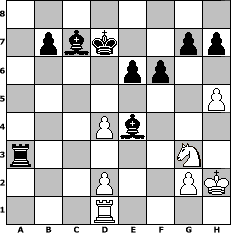 Partie-Notation im PGN-Format [Event "101 Geburtstag von Miguel Najdorf"] [Site "www.mySchach.de"] [Date "2011.04.15"] [Round "1"] [White "Knight"] [Black "woern63"] [ECO "D00"] [WhitemyELO "1178"] [BlackmyELO "1891"] [Result "0-1"] [TimeControl "10/1728000"] [WhiteDays "60"] [BlackDays "57"] [MySchachNr "73328"] 1. d4 d5 2. e4 e6 3. Nc3 dxe4 4. Nxe4 Bd7 5. Nf3 Bc6 6. Ng3 Nd7 7. Bg5 Bxf3 8. Bxd8 Bxd1 9. Bxc7 Bxc2 10. Bb5 Bb4+ 11. Kf1 a6 12. Bxd7+ Kxd7 13. Be5 f6 14. Bf4 Ne7 15. a3 Bd3+ 16. Kg1 Ba5 17. b4 Bb6 18. h4 Nd5 19. Be3 a5 20. bxa5 Rxa5 21. Kh2 Nxe3 22. fxe3 Rha8 23. Rhd1 Rxa3 24. Rxa3 Rxa3 25. h5 Bc7 26. e4 Bxe4 0-1 Stellungs-Notation im FEN-Format 8/1pbk2pp/4pp2/7P/3Pb3/r5N1/3P2PK/3R4 - - - 0 27 Geschlagene Figuren Weiss: Geschlagene Figuren Schwarz: Klicken Sie auf eine geschlagene Figur um den gewünschten Zug darzustellen!