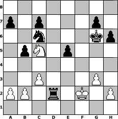 Partie-Notation im PGN-Format [Event "Schach f"] [Site "www.mySchach.de"] [Date "2008.08.25"] [Round "2"] [White "Leeloo"] [Black "rakl"] [ECO "C24"] [WhitemyELO "1566"] [BlackmyELO "1754"] [Result "0-1"] [TimeControl "10/2592000"] [WhiteDays "20"] [BlackDays "30"] [MySchachNr "47469"] 1. e4 e5 2. Bc4 Nf6 3. d3 d5 4. exd5 Nxd5 5. Nf3 Nc6 6. Nc3 Be6 7. Bg5 Nxc3 8. Bxd8 Nxd1 9. Bxe6 Rxd8 10. Bxf7+ Kxf7 11. Rxd1 Bc5 12. O-O h6 13. Rfe1 Rhe8 14. Nd2 b5 15. Ne4 Bb6 16. c3 Rd7 17. g3 Red8 18. Re3 Bxe3 19. fxe3 Rxd3 20. Rf1+ Kg6 21. Kg2 Rxe3 22. Nc5 Re2+ 23. Rf2 Rxf2+ 24. Kxf2 Rd2+ 0-1 Stellungs-Notation im FEN-Format 8/p1p3p1/2n3kp/1pN1p3/8/2P3P1/PP1r1K1P/8 - - - 1 25 Geschlagene Figuren Weiss: Geschlagene Figuren Schwarz: Klicken Sie auf eine geschlagene Figur um den gewünschten Zug darzustellen!