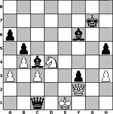 Partie-Notation im PGN-Format [Event "Najdorf mit f4"] [Site "www.mySchach.de"] [Date "2022.02.01"] [Round "1"] [White "Seneca"] [Black "Grubengeist"] [ECO "B93"] [WhitemyELO "1533"] [BlackmyELO "2008"] [Result "0-1"] [TimeControl "10/2592000"] [WhiteDays "122"] [BlackDays "150"] [MySchachNr "124480"] 1. e4 c5 2. Nf3 d6 3. d4 cxd4 4. Nxd4 Nf6 5. Nc3 a6 6. f4 Nbd7 7. Bd3 g6 8. O-O Bg7 9. Bd2 Nxe4 10. Nce2 Nxd2 11. Qxd2 O-O 12. c3 Qb6 13. Kh1 e5 14. fxe5 dxe5 15. Nb3 Nc5 16. Bc2 Be6 17. Qe3 Rac8 18. Ng3 Qc7 19. Ne4 Nxe4 20. Bxe4 f5 21. Bc2 Rfd8 22. Rad1 Rxd1 23. Rxd1 Bf6 24. a3 Kg7 25. Nd2 Rd8 26. Nf3 Rxd1+ 27. Bxd1 Qd6 28. Be2 h5 29. h3 e4 30. Nd4 Bf7 31. b4 b5 32. Kg1 Qe5 33. g3 g5 34. Kg2 f4 35. gxf4 gxf4 36. Qf2 f3+ 37. Bxf3 exf3+ 38. Kg1 Qg5+ 39. Kf1 Bc4+ 40. Ke1 Qc1# 0-1 Stellungs-Notation im FEN-Format 8/6k1/p4b2/1p5p/1PbN4/P1P2p1P/5Q2/2q1K3 - - - 6 41 Geschlagene Figuren Weiss: Geschlagene Figuren Schwarz: Klicken Sie auf eine geschlagene Figur um den gewünschten Zug darzustellen!