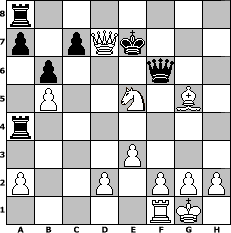Partie-Notation im PGN-Format [Event "Affenbande"] [Site "www.mySchach.de"] [Date "2010.02.25"] [Round "1"] [White "Helmut48"] [Black "rikilatic"] [ECO "A00"] [WhitemyELO "1827"] [BlackmyELO "1410"] [Result "1-0"] [TimeControl "10/864000"] [WhiteDays "30"] [BlackDays "30"] [MySchachNr "63556"] 1. b4 e5 2. Bb2 Nc6 3. b5 Nd4 4. e3 Nf5 5. Bxe5 d6 6. Bb2 b6 7. Nf3 Nf6 8. Bd3 Nh6 9. c4 Bb7 10. Nc3 Be7 11. O-O d5 12. Nxd5 Nxd5 13. cxd5 Bxd5 14. Bxg7 Bf6 15. Bxh6 Bxa1 16. Qxa1 Rg8 17. Qe5+ Be6 18. Bxh7 Rg4 19. Bf5 Ra4 20. Bxe6 fxe6 21. Qxe6+ Qe7 22. Qg8+ Kd7 23. Qd5+ Qd6 24. Ne5+ Ke7 25. Bg5+ Qf6 26. Qd7+ 1-0 Stellungs-Notation im FEN-Format r7/p1pQk3/1p3q2/1P2N1B1/r7/4P3/P2P1PPP/5RK1 - - - 10 26 Geschlagene Figuren Weiss: Geschlagene Figuren Schwarz: Klicken Sie auf eine geschlagene Figur um den gewünschten Zug darzustellen!