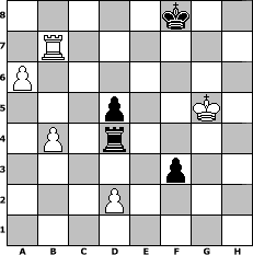 Partie-Notation im PGN-Format [Event "Mal wieder spielen ?"] [Site "www.mySchach.de"] [Date "2012.04.09"] [Round "1"] [White "espero"] [Black "ujack1961"] [ECO "D00"] [WhitemyELO "1651"] [BlackmyELO "1743"] [Result "1-0"] [TimeControl "10/2592000"] [WhiteDays "159"] [BlackDays "126"] [MySchachNr "80990"] 1. d4 d5 2. Bf4 e6 3. c4 c6 4. e3 Bb4+ 5. Nc3 Nf6 6. Qb3 Qa5 7. a3 Bxc3+ 8. bxc3 O-O 9. Nf3 dxc4 10. Bxc4 b5 11. Bd3 Nd5 12. Bd6 Rd8 13. Bb4 Nxb4 14. cxb4 Qc7 15. O-O a5 16. Ng5 h6 17. Ne4 a4 18. Qc3 Bb7 19. Rac1 f5 20. Nc5 Bc8 21. f4 Qd6 22. Bb1 Nd7 23. Nd3 Bb7 24. Ba2 Rac8 25. h3 Nf6 26. Nc5 Nd5 27. Bxd5 cxd5 28. Nxb7 Rxc3 29. Nxd6 Rxc1 30. Rxc1 Rxd6 31. Rc7 Rb6 32. g4 g6 33. Kf2 fxg4 34. hxg4 Rb8 35. Kg3 Rb6 36. f5 gxf5 37. gxf5 exf5 38. Rc5 Re6 39. Kf3 Rd6 40. Rxb5 h5 41. Ra5 Kg7 42. Rxa4 Rd8 43. Ra5 h4 44. a4 Kf6 45. Kf4 h3 46. Ra6+ Kg7 47. Kg3 Re8 48. Kxh3 Rxe3+ 49. Kh4 Rd3 50. Kg5 Rxd4 51. Ra7+ Kf8 52. Rb7 f4 53. a5 f3 54. a6 1-0 Stellungs-Notation im FEN-Format 5k2/1R6/P7/3p2K1/1P1r4/5p2/3P4/8 - - - 0 54 Geschlagene Figuren Weiss: Geschlagene Figuren Schwarz: Klicken Sie auf eine geschlagene Figur um den gewünschten Zug darzustellen!