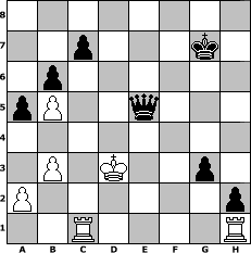 Partie-Notation im PGN-Format [Event "Schneeturnier"] [Site "www.mySchach.de"] [Date "2010.02.08"] [Round "1"] [White "bruno"] [Black "HenrySchinasky"] [ECO "A16"] [WhitemyELO "1773"] [BlackmyELO "2154"] [Result "0-1"] [TimeControl "10/2592000"] [WhiteDays "149"] [BlackDays "145"] [MySchachNr "63063"] 1. c4 Nf6 2. Nc3 g6 3. d4 Bg7 4. Nf3 O-O 5. e4 d6 6. h3 e5 7. d5 a5 8. Bd3 b6 9. O-O Na6 10. Bc2 Nc5 11. Nb5 Nfxe4 12. Re1 f5 13. h4 Nf6 14. Be3 Bd7 15. Qd2 Bxb5 16. cxb5 Ng4 17. Bxc5 dxc5 18. Ng5 e4 19. Bd1 Bd4 20. Bxg4 fxg4 21. Ne6 Qxh4 22. Nxd4 Rxf2 23. Qxf2 g3 24. Qc2 Qh2+ 25. Kf1 Rf8+ 26. Ke2 Rf2+ 27. Kd1 Rxc2 28. Nxc2 Qxg2 29. Re2 Qf1+ 30. Ne1 Kg7 31. Rg2 h5 32. Rxg3 h4 33. Re3 h3 34. Re2 Qf4 35. Kc2 e3 36. b3 c4 37. Rc1 h2 38. Nd3 cxd3+ 39. Kxd3 Qf5+ 40. Kd4 Qf4+ 41. Kd3 Qe5 42. Ree1 g5 43. Ke2 g4 44. Rh1 Qxd5 45. Kxe3 Qe5+ 46. Kd3 g3 0-1 Stellungs-Notation im FEN-Format 8/2p3k1/1p6/pP2q3/8/1P1K2p1/P6p/2R4R - - - 0 47 Geschlagene Figuren Weiss: Geschlagene Figuren Schwarz: Klicken Sie auf eine geschlagene Figur um den gewünschten Zug darzustellen!