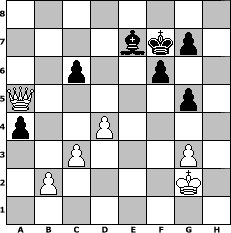 Partie-Notation im PGN-Format [Event "Summer Games 2021"] [Site "www.mySchach.de"] [Date "2021.08.01"] [Round "1"] [White "wolni55"] [Black "beowulf"] [ECO "C55"] [WhitemyELO "1348"] [BlackmyELO "1373"] [Result "1-0"] [TimeControl "10/86400"] [WhiteDays "01"] [BlackDays "01"] [MySchachNr "122653"] 1. e4 e5 2. Nf3 Nc6 3. Bc4 Nf6 4. d3 Bb4+ 5. c3 Ba5 6. a4 a6 7. Ng5 O-O 8. Qb3 Qe8 9. Be3 d6 10. h4 h6 11. Nf3 Ng4 12. Bd5 Nxe3 13. fxe3 Bb6 14. Ke2 Bg4 15. h5 Rb8 16. Rh4 Bxf3+ 17. Kxf3 Ne7 18. d4 Nxd5 19. Qxd5 exd4 20. exd4 Qe7 21. g3 Rfe8 22. Nd2 c6 23. Qf5 Rbd8 24. Rf1 d5 25. Kg2 dxe4 26. Nxe4 Rd5 27. Qf4 Rxh5 28. Rxh5 Bc7 29. Qf3 f6 30. Rh4 b5 31. Rg4 Kf7 32. Qf5 a5 33. Re1 Bd8 34. Ng5+ hxg5 35. Rxe7+ Rxe7 36. Re4 bxa4 37. Rxe7+ Bxe7 38. Qxa5 1-0 Stellungs-Notation im FEN-Format 8/4bkp1/2p2p2/Q5p1/p2P4/2P3P1/1P4K1/8 - - - 0 38 Geschlagene Figuren Weiss: Geschlagene Figuren Schwarz: Klicken Sie auf eine geschlagene Figur um den gewünschten Zug darzustellen!