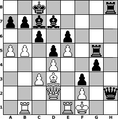 Partie-Notation im PGN-Format [Event "Trompowsky-Angriff"] [Site "www.mySchach.de"] [Date "2011.04.27"] [Round "1"] [White "Caligula"] [Black "faustballer"] [ECO "A45"] [WhitemyELO "1279"] [BlackmyELO "1537"] [Result "0-1"] [TimeControl "10/2592000"] [WhiteDays "119"] [BlackDays "119"] [MySchachNr "73518"] 1. d4 Nf6 2. Bg5 Ne4 3. Bf4 e6 4. Nf3 h6 5. Nbd2 Nxd2 6. Qxd2 Nc6 7. e4 Bb4 8. c3 Ba5 9. Bb5 Ne7 10. b4 Bb6 11. O-O c6 12. Bd3 Ng6 13. a4 d6 14. e5 Nxf4 15. Qxf4 d5 16. Rfe1 Qe7 17. a5 Bc7 18. Rab1 Bd7 19. Qe3 g5 20. g4 O-O-O 21. Qe2 h5 22. Qe3 hxg4 23. Nxg5 Rh5 24. Qf4 Rxg5 25. Qe3 Rh8 26. Qe2 f5 27. b5 Qh7 28. Qe3 Qxh2+ 29. Kf1 f4 30. Qd2 f3 0-1 Stellungs-Notation im FEN-Format 2k4r/ppbb4/2p1p3/PP1pP1r1/3P2p1/2PB1p2/3Q1P1q/1R2RK2 - - - 0 31 Geschlagene Figuren Weiss: Geschlagene Figuren Schwarz: Klicken Sie auf eine geschlagene Figur um den gewünschten Zug darzustellen!