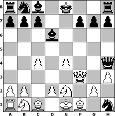 Partie-Notation im PGN-Format [Event "Abermals Aljechin"] [Site "www.mySchach.de"] [Date "2011.02.13"] [Round "1"] [White "muellerh"] [Black "woern63"] [ECO "A52"] [WhitemyELO "1531"] [BlackmyELO "1845"] [Result "0-1"] [TimeControl "10/1728000"] [WhiteDays "01"] [BlackDays "20"] [MySchachNr "71984"] 1. d4 Nf6 2. c4 e5 3. dxe5 Ng4 4. e4 d6 5. exd6 Bxd6 6. h3 Qh4 7. Qf3 Nxf2 8. Ne2 Nxh1+ 0-1 Stellungs-Notation im FEN-Format rnb1k2r/ppp2ppp/3b4/8/2P1P2q/5Q1P/PP1PN1P1/RNB1KB1n - KQkq - 0 9 Geschlagene Figuren Weiss: Geschlagene Figuren Schwarz: Klicken Sie auf eine geschlagene Figur um den gewünschten Zug darzustellen!