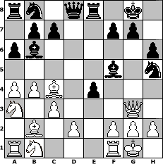 Partie-Notation im PGN-Format [Event "9er3"] [Site "www.mySchach.de"] [Date "2013.06.12"] [Round "1"] [White "Joschi"] [Black "Adlerauge"] [ECO "C41"] [WhitemyELO "1564"] [BlackmyELO "1500"] [Result "0-1"] [TimeControl "10/3456000"] [WhiteDays "39"] [BlackDays "29"] [MySchachNr "88711"] 1. e4 e5 2. Nf3 d6 3. Bc4 Nf6 4. Ng5 d5 5. exd5 h6 6. Nf3 e4 7. Qe2 Bb4 8. c3 O-O 9. Nd4 Bg4 10. Qe3 Bc5 11. O-O Re8 12. b4 Bb6 13. a4 Nxd5 14. Qg3 Nf6 15. Nb5 a6 16. N5a3 Bf5 17. Bb2 Nh5 0-1 Stellungs-Notation im FEN-Format rn1qr1k1/1pp2pp1/pb5p/5b1n/PPB1p3/N1P3Q1/1B1P1PPP/RN3RK1 - - - 4 18 Geschlagene Figuren Weiss: Geschlagene Figuren Schwarz: Klicken Sie auf eine geschlagene Figur um den gewünschten Zug darzustellen!