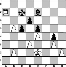 Partie-Notation im PGN-Format [Event "Love, Peace and Harmony 1"] [Site "www.mySchach.de"] [Date "2010.05.08"] [Round "1"] [White "ujack1961"] [Black "Zargoz"] [ECO "C50"] [WhitemyELO "1598"] [BlackmyELO "1515"] [Result "1-0"] [TimeControl "10/864000"] [WhiteDays "39"] [BlackDays "13"] [MySchachNr "65422"] 1. e4 e5 2. Nf3 Nc6 3. Bc4 f6 4. Nh4 d6 5. Qh5+ g6 6. Nxg6 hxg6 7. Qxh8 Nh6 8. d3 g5 9. Qh7 Nd4 10. Bb3 c5 11. c4 Qe7 12. Qxe7+ Kxe7 13. Be3 Nxb3 14. axb3 a6 15. Nc3 Ng4 16. Nd5+ Kf7 17. Nb6 Rb8 18. Nxc8 Rxc8 19. O-O Nxe3 20. fxe3 Bh6 21. Ra4 g4 22. Re1 Bg5 23. g3 Kg6 24. b4 Rc6 25. b5 axb5 26. cxb5 Rc7 27. Kf2 Rd7 28. Rea1 f5 29. exf5+ Kxf5 30. e4+ Ke6 31. Ra8 Rg7 32. Rb8 Rf7+ 33. Ke2 Rd7 34. Ra7 b6 35. Rxd7 Kxd7 36. Rxb6 Kc7 37. Ra6 Be7 38. Ra7+ 1-0 Stellungs-Notation im FEN-Format 8/R1k1b3/3p4/1Pp1p3/4P1p1/3P2P1/1P2K2P/8 - - - 4 38 Geschlagene Figuren Weiss: Geschlagene Figuren Schwarz: Klicken Sie auf eine geschlagene Figur um den gewünschten Zug darzustellen!
