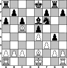 Partie-Notation im PGN-Format [Event "Bremer Schl"] [Site "www.mySchach.de"] [Date "2008.11.01"] [Round "2"] [White "dbuse"] [Black "martinus"] [ECO "B33"] [WhitemyELO "2055"] [BlackmyELO "1928"] [Result "1/2-1/2"] [TimeControl "10/2592000"] [WhiteDays "59"] [BlackDays "55"] [MySchachNr "49462"] 1. e4 c5 2. Nf3 Nc6 3. d4 cxd4 4. Nxd4 Nf6 5. Nc3 a6 6. Nxc6 dxc6 7. Qxd8+ Kxd8 8. Bf4 Ke8 9. Be2 Rg8 10. f3 g5 11. Be3 e5 12. Na4 Be6 13. Nc5 Bxc5 14. Bxc5 g4 1/2-1/2 Stellungs-Notation im FEN-Format r3k1r1/1p3p1p/p1p1bn2/2B1p3/4P1p1/5P2/PPP1B1PP/R3K2R - KQ - 0 15 Geschlagene Figuren Weiss: Geschlagene Figuren Schwarz: Klicken Sie auf eine geschlagene Figur um den gewünschten Zug darzustellen!