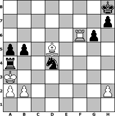Partie-Notation im PGN-Format [Event "Albspiele 5"] [Site "www.mySchach.de"] [Date "2010.07.03"] [Round "1"] [White "muellerh"] [Black "reisender"] [ECO "E76"] [WhitemyELO "1449"] [BlackmyELO "1431"] [Result "0-1"] [TimeControl "10/1728000"] [WhiteDays "20"] [BlackDays "20"] [MySchachNr "66774"] 1. d4 Nf6 2. c4 g6 3. Nc3 Bg7 4. e4 d6 5. f4 O-O 6. Nf3 c5 7. d5 e6 8. e5 dxe5 9. fxe5 Ng4 10. Bg5 f6 11. exf6 Bxf6 12. Bxf6 Rxf6 13. Be2 Ne3 14. Qd2 Nxg2+ 15. Kd1 Qe8 16. Rg1 Nf4 17. Ne4 Rf8 18. Nxc5 b6 19. Nxe6 Bxe6 20. dxe6 Qxe6 21. Nd4 Qf6 22. Rf1 Nd7 23. Kc2 Rad8 24. Bf3 Ne5 25. Bd5+ Kh8 26. Ne6 Nxc4 27. Qc3 Ne3+ 28. Qxe3 Qf5+ 29. Qe4 Qxe4+ 30. Bxe4 Nxe6 31. Rae1 Nd4+ 32. Kc3 Nb5+ 33. Kb4 a6 34. Bc6 Rxf1 35. Rxf1 Nd4 36. Rf6 Rc8 37. Bb7 a5+ 38. Ka4 Rc4+ 39. Ka3 b5 40. Bd5 Ra4# 0-1 Stellungs-Notation im FEN-Format 7k/7p/5Rp1/pp1B4/r2n4/K7/PP5P/8 - - - 2 41 Geschlagene Figuren Weiss: Geschlagene Figuren Schwarz: Klicken Sie auf eine geschlagene Figur um den gewünschten Zug darzustellen!
