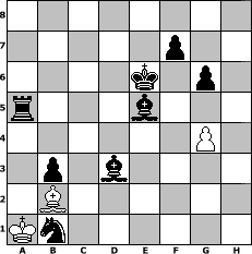 Partie-Notation im PGN-Format [Event "?"] [Site "www.mySchach.de"] [Date "2023.10.22"] [Round "?"] [White "Clod64@"] [Black "Ilona"] [ECO "C20"] [WhitemyELO "1500"] [BlackmyELO "1016"] [Result "0-1"] [TimeControl "10/864000"] [WhiteDays "09"] [BlackDays "06"] [MySchachNr "130864"] 1. e4 e5 2. Qf3 Nf6 3. Nc3 Bc5 4. Nd5 c6 5. Nc3 O-O 6. h4 d5 7. exd5 Bg4 8. Qg3 Qd6 9. f3 Bf5 10. h5 cxd5 11. Bd3 e4 12. Qxd6 Bxd6 13. fxe4 Bg3+ 14. Kf1 dxe4 15. Bc4 g6 16. hxg6 hxg6 17. Nge2 Re8 18. Nd4 Nbd7 19. Bb5 a6 20. Bc4 b5 21. Be2 b4 22. Na4 e3 23. dxe3 Rxe3 24. Bxe3 Ne4 25. Nc6 Kg7 26. Ne7 Kf6 27. Nc6 Rc8 28. Nxb4 a5 29. Nd5+ Ke6 30. Rd1 Rxc2 31. Bd3 Rf2+ 32. Ke1 Kxd5 33. Nb6+ Nxb6 34. b4 Nc3 35. Bb5+ Nxd1 36. Kxd1 Bc2+ 37. Kc1 Be4 38. Rd1+ Ke5 39. Bd4+ Kd5 40. Bg7+ Ke6 41. Bd4 Rc2+ 42. Kb1 Bc7 43. g4 axb4 44. a4 Nd5 45. Be8 b3 46. Bb2 Be5 47. Bc6 Rxc6+ 48. Rd3 Bxd3+ 49. Ka1 Nc3 50. a5 Ra6 51. Ba3 Nb1+ 52. Bb2 Rxa5# 0-1 Stellungs-Notation im FEN-Format 8/5p2/4k1p1/r3b3/6P1/1p1b4/1B6/Kn6 - - - 0 53 Geschlagene Figuren Weiss: Geschlagene Figuren Schwarz: Klicken Sie auf eine geschlagene Figur um den gewünschten Zug darzustellen!
