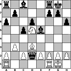 Partie-Notation im PGN-Format [Event "^^Lust, Laune und Spannung am Schach!!!^^"] [Site "www.mySchach.de"] [Date "2007.09.24"] [Round "1"] [White "bruno"] [Black "bernhard"] [ECO "C41"] [WhitemyELO "1483"] [BlackmyELO "1605"] [Result "0-1"] [TimeControl "10/864000"] [WhiteDays "20"] [BlackDays "20"] [MySchachNr "38459"] 1. e4 e5 2. Nf3 d6 3. d4 Nf6 4. Nc3 exd4 5. Nxd4 a6 6. Bg5 Be7 7. Bd3 h6 8. Be3 Ng4 9. Qf3 Nxe3 10. Qxe3 c5 11. Nf3 Nc6 12. O-O Bf6 13. Qd2 O-O 14. b3 Qa5 15. e5 Nxe5 16. Nxe5 Bxe5 17. Nd5 Qxd2 0-1 Stellungs-Notation im FEN-Format r1b2rk1/1p3pp1/p2p3p/2pNb3/8/1P1B4/P1PqPPPP/R4RK1 - - - 0 18 Geschlagene Figuren Weiss: Geschlagene Figuren Schwarz: Klicken Sie auf eine geschlagene Figur um den gewünschten Zug darzustellen!