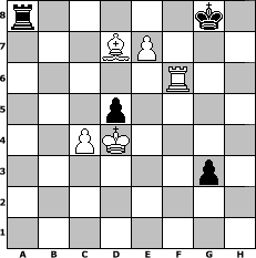 Partie-Notation im PGN-Format [Event "Arpad Elo Geburtstagstunier"] [Site "www.mySchach.de"] [Date "2011.08.23"] [Round "1"] [White "Erich"] [Black "Lemmi11"] [ECO "A00"] [WhitemyELO "1926"] [BlackmyELO "1771"] [Result "1-0"] [TimeControl "10/1728000"] [WhiteDays "20"] [BlackDays "20"] [MySchachNr "75682"] 1. Nc3 Nc6 2. d4 d5 3. e4 dxe4 4. d5 Nb8 5. Nxe4 Nf6 6. Nxf6+ exf6 7. Bf4 Bd6 8. Qe2+ Be7 9. O-O-O O-O 10. Qf3 Bd6 11. Qg3 Bxf4+ 12. Qxf4 Qd6 13. Qxd6 cxd6 14. Ne2 Nd7 15. Nd4 Nb6 16. c4 Bg4 17. f3 Bd7 18. b3 Rfe8 19. Bd3 g6 20. g4 a5 21. Kd2 Re5 22. h4 a4 23. h5 Kg7 24. Rh4 axb3 25. axb3 Ree8 26. Kc3 h6 27. hxg6 fxg6 28. Rdh1 Rh8 29. f4 Rac8 30. Kd2 Ra8 31. f5 g5 32. R4h3 Ra2+ 33. Kc3 Na8 34. Ne6+ Bxe6 35. dxe6 Nc7 36. Be4 b5 37. Rd3 bxc4 38. bxc4 Rc8 39. Rb1 Ra3+ 40. Kd4 Rxd3+ 41. Bxd3 Ne8 42. Bc2 Kg8 43. Rb7 Ng7 44. Rf7 h5 45. Rxf6 hxg4 46. Rg6 Kf8 47. Rxg5 Ne8 48. Ba4 Nf6 49. Rg6 Ng8 50. Bd7 Ra8 51. f6 g3 52. Rg7 Nxf6 53. Rf7+ Kg8 54. Rxf6 d5 55. e7 1-0 Stellungs-Notation im FEN-Format r5k1/3BP3/5R2/3p4/2PK4/6p1/8/8 - - - 0 55 Geschlagene Figuren Weiss: Geschlagene Figuren Schwarz: Klicken Sie auf eine geschlagene Figur um den gewünschten Zug darzustellen!
