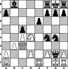 Partie-Notation im PGN-Format [Event "Zum tot von Tupac Shakura"] [Site "www.mySchach.de"] [Date "2006.09.13"] [Round "1"] [White "Knight"] [Black "romain63"] [Variant "Fischerrandom"] [SetUp "1"] [FEN "bbqnnrkr/pppppppp/8/8/8/8/PPPPPPPP/BBQNNRKR w KQkq - 0 1"] [WhitemyELO "1373"] [BlackmyELO "1724"] [Result "0-1"] [TimeControl "10/2592000"] [WhiteDays "56"] [BlackDays "59"] [MySchachNr "28412"] 1. d4 b6 2. e4 Bxe4 3. Nc3 Qb7 4. Nxe4 Qxe4 5. Nf3 Ne6 6. c3 Qb7 7. Re1 c5 8. Be4 d5 9. Bf5 Nf4 10. dxc5 bxc5 11. b3 e6 12. Bg4 Nf6 13. c4 Nxg4 14. Qc3 d4 15. Nxd4 Qxg2# 0-1 Stellungs-Notation im FEN-Format 1b3rkr/p4ppp/4p3/2p5/2PN1nn1/1PQ5/P2P1PqP/B3R1KR - Kkq - 0 16 Geschlagene Figuren Weiss: Geschlagene Figuren Schwarz: Klicken Sie auf eine geschlagene Figur um den gewünschten Zug darzustellen!
