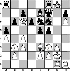 Partie-Notation im PGN-Format [Event "1000 Jahre Schachdorf Str"] [Site "www.mySchach.de"] [Date "2011.08.22"] [Round "1"] [White "Svetlana"] [Black "Erich"] [ECO "C24"] [WhitemyELO "1729"] [BlackmyELO "1926"] [Result "1/2-1/2"] [TimeControl "10/2592000"] [WhiteDays "27"] [BlackDays "30"] [MySchachNr "75663"] 1. e4 e5 2. Bc4 Nf6 3. d3 Nc6 4. Nf3 Be7 5. O-O O-O 6. Re1 d6 7. a4 Be6 8. Nbd2 Nd7 9. c3 a5 10. h3 Bf6 11. Nb3 Bxc4 12. dxc4 Re8 13. Qd5 Ne7 14. Qd1 Ng6 15. Be3 b6 16. g3 Qc8 17. h4 Be7 18. h5 Ngf8 19. h6 g6 20. Qd3 Ne6 21. Rad1 Rf8 22. Kg2 Qd8 23. Ra1 Qe8 24. Rh1 f5 25. exf5 gxf5 26. Qd5 Qf7 27. Rag1 Nf6 28. Qc6 1/2-1/2 Stellungs-Notation im FEN-Format r4rk1/2p1bq1p/1pQpnn1P/p3pp2/P1P5/1NP1BNP1/1P2PPK1/6RR - - - 5 28 Geschlagene Figuren Weiss: Geschlagene Figuren Schwarz: Klicken Sie auf eine geschlagene Figur um den gewünschten Zug darzustellen!