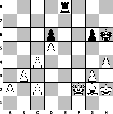 Partie-Notation im PGN-Format [Event "Mach dir ein paar sch"] [Site "www.mySchach.de"] [Date "2009.03.14"] [Round "1"] [White "Zoidberg"] [Black "bruno"] [ECO "A35"] [WhitemyELO "1837"] [BlackmyELO "1702"] [Result "1-0"] [TimeControl "10/2592000"] [WhiteDays "115"] [BlackDays "120"] [MySchachNr "53835"] 1. c4 c5 2. Nc3 Nc6 3. Nf3 d6 4. g3 Nf6 5. Bg2 e5 6. d3 Bf5 7. O-O Be7 8. e4 Bg4 9. Be3 O-O 10. h3 Bxf3 11. Bxf3 Nd4 12. Bg2 h6 13. Ne2 Qb6 14. b3 Nc6 15. f4 exf4 16. Nxf4 Ne5 17. Qd2 Qa6 18. d4 cxd4 19. Bxd4 Rad8 20. Nd5 Nxd5 21. exd5 Nd7 22. Rae1 Bf6 23. Bxf6 Nxf6 24. Rxf6 gxf6 25. Qxh6 Qb6+ 26. Kh1 Qd4 27. Re4 Qa1+ 28. Kh2 f5 29. Qg5+ Qg7 30. Qxf5 Qg6 31. Rg4 Kh7 32. Rxg6 fxg6 33. Qe6 Rfe8 34. Qf7+ Kh6 35. h4 Rf8 36. Qxb7 Rde8 37. Qxa7 Rf2 38. Qxf2 1-0 Stellungs-Notation im FEN-Format 4r3/8/3p2pk/3P4/2P4P/1P4P1/P1P2QBK/8 - - - 0 38 Geschlagene Figuren Weiss: Geschlagene Figuren Schwarz: Klicken Sie auf eine geschlagene Figur um den gewünschten Zug darzustellen!
