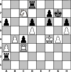 Partie-Notation im PGN-Format [Event "Herbstopen"] [Site "www.mySchach.de"] [Date "2008.09.26"] [Round "1"] [White "Helmut48"] [Black "Master1"] [ECO "C23"] [WhitemyELO "1417"] [BlackmyELO "1255"] [Result "1/2-1/2"] [TimeControl "10/864000"] [WhiteDays "40"] [BlackDays "34"] [MySchachNr "48425"] 1. e4 e5 2. Bc4 Bc5 3. Qh5 Qe7 4. d3 Nf6 5. Qf3 Nc6 6. c3 O-O 7. Bg5 a6 8. b4 Bd6 9. h3 b5 10. Bd5 Bb7 11. a3 Rab8 12. Ne2 Nd8 13. Bxb7 Nxb7 14. Ng3 Nd8 15. O-O Ne6 16. Bxf6 Qxf6 17. Qxf6 gxf6 18. Nf5 Ng7 19. Nxd6 cxd6 20. g4 Ne6 21. Kh2 Ng5 22. Kg3 Ne6 23. Ra2 Kg7 24. Rd2 Kg6 25. d4 Ng5 26. f4 Nxe4+ 27. Kf3 Nxd2+ 28. Nxd2 exf4 29. Kxf4 Rbc8 30. Rc1 d5 31. h4 h6 32. h5+ Kg7 33. Nf1 Rce8 34. Ne3 d6 35. Nxd5 Re2 36. c4 Ra2 37. Rc3 bxc4 38. Nc7 Rd8 39. d5 1/2-1/2 Stellungs-Notation im FEN-Format 3r4/2N2pk1/p2p1p1p/3P3P/1Pp2KP1/P1R5/r7/8 - - - 0 39 Geschlagene Figuren Weiss: Geschlagene Figuren Schwarz: Klicken Sie auf eine geschlagene Figur um den gewünschten Zug darzustellen!