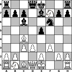 Partie-Notation im PGN-Format [Event "Spa"] [Site "www.mySchach.de"] [Date "2011.11.25"] [Round "1"] [White "sprinterde"] [Black "lotchi"] [ECO "C55"] [WhitemyELO "1656"] [BlackmyELO "1321"] [Result "1-0"] [TimeControl "10/864000"] [WhiteDays "19"] [BlackDays "17"] [MySchachNr "77636"] 1. e4 e5 2. Nf3 Nc6 3. Bc4 Nf6 4. d3 Bb4+ 5. c3 Be7 6. Ng5 d5 7. exd5 Bg4 8. f3 Bd7 9. dxc6 Bxc6 10. Nxf7 1-0 Stellungs-Notation im FEN-Format r2qk2r/ppp1bNpp/2b2n2/4p3/2B5/2PP1P2/PP2P1PP/RNBQK2R - KQkq - 0 10 Geschlagene Figuren Weiss: Geschlagene Figuren Schwarz: Klicken Sie auf eine geschlagene Figur um den gewünschten Zug darzustellen!