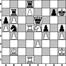 Partie-Notation im PGN-Format [Event "\" Zum Ab-u.Angew"] [Site "www.mySchach.de"] [Date "2012.08.06"] [Round "1"] [White "BobbyF4"] [Black "faustballer"] [ECO "A01"] [WhitemyELO "1544"] [BlackmyELO "1547"] [Result "0-1"] [TimeControl "10/864000"] [WhiteDays "00"] [BlackDays "10"] [MySchachNr "83153"] 1. b3 d5 2. Bb2 e6 3. e3 Nc6 4. Nf3 a6 5. Be2 Nf6 6. d3 Bb4+ 7. Nbd2 Be7 8. a4 b6 9. O-O Bb7 10. c3 O-O 11. b4 b5 12. d4 Na7 13. Ne5 Bd6 14. f4 Bxe5 15. dxe5 Nd7 16. a5 f6 17. Bg4 f5 18. Bf3 Rb8 19. g4 Bc8 20. gxf5 exf5 21. Bxd5+ Kh8 22. c4 c6 23. cxb5 cxd5 24. b6 Nb5 25. Nf3 Rf7 26. Qxd5 Rf8 27. Rad1 h6 28. e6 Bb7 29. exd7 Bxd5 30. Rxd5 Qe7 31. Ne5 Qe6 32. Rfd1 Rfd8 33. h4 h5 34. Kg2 Kh7 35. Kh2 Rb7 0-1 Stellungs-Notation im FEN-Format 3r4/1r1P2pk/pP2q3/Pn1RNp1p/1P3P1P/4P3/1B5K/3R4 - - - 4 36 Geschlagene Figuren Weiss: Geschlagene Figuren Schwarz: Klicken Sie auf eine geschlagene Figur um den gewünschten Zug darzustellen!