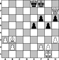 Partie-Notation im PGN-Format [Event "Sweety Tunier"] [Site "www.mySchach.de"] [Date "2006.02.28"] [Round "1"] [White "Falcor"] [Black "Master1"] [ECO "D06"] [WhitemyELO "1422"] [BlackmyELO "1099"] [Result "1-0"] [TimeControl "10/2592000"] [WhiteDays "089"] [BlackDays "115"] [MySchachNr "22932"] 1. d4 d5 2. c4 Nf6 3. Nc3 e6 4. Bg5 Bb4 5. Qc2 Nbd7 6. a3 Be7 7. Nf3 dxc4 8. e3 O-O 9. Bxc4 h6 10. Bh4 a6 11. O-O b5 12. Ba2 Bb7 13. Nd2 c5 14. e4 cxd4 15. Ne2 Ne5 16. Nc1 d3 17. Qc3 Nxe4 18. Nxe4 Bxe4 19. Bxe7 Qxe7 20. Qxe5 Bg6 21. Rd1 Rad8 22. Bb1 f6 23. Qe3 d2 24. Bxg6 dxc1=Q 25. Raxc1 Rxd1+ 26. Rxd1 Rd8 27. Re1 e5 28. h3 Qd7 29. Qe2 a5 30. Bc2 a4 31. Rd1 Qe7 32. Rxd8+ Qxd8 33. Qxb5 Qa8 34. Bxa4 g5 35. Bb3+ Kf8 36. Qd7 Qe8 37. Qh7 1-0 Stellungs-Notation im FEN-Format 4qk2/7Q/5p1p/4p1p1/8/PB5P/1P3PP1/6K1 - - - 5 37 Geschlagene Figuren Weiss: Geschlagene Figuren Schwarz: Klicken Sie auf eine geschlagene Figur um den gewünschten Zug darzustellen!
