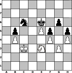 Partie-Notation im PGN-Format [Event "Februar-Open 2/6"] [Site "www.mySchach.de"] [Date "2008.02.20"] [Round "1"] [White "muetoe"] [Black "nordlicht"] [ECO "A20"] [WhitemyELO "1901"] [BlackmyELO "2026"] [Result "1/2-1/2"] [TimeControl "10/1728000"] [WhiteDays "17"] [BlackDays "19"] [MySchachNr "42778"] 1. c4 e5 2. g3 c6 3. d4 exd4 4. Qxd4 Nf6 5. Bg2 Be7 6. Nf3 O-O 7. Nc3 d5 8. cxd5 cxd5 9. O-O Nc6 10. Qa4 Qb6 11. Qb5 Qxb5 12. Nxb5 Bg4 13. Rd1 a6 14. Nc7 Rad8 15. h3 Bf5 16. Bf4 Bc2 17. Rd2 Be4 18. Ne5 Nb4 19. a3 Bxg2 20. Kxg2 Bd6 21. Ng4 Ne4 22. Rdd1 Bxc7 23. Bxc7 Rd7 24. axb4 Rxc7 25. Ne3 Nf6 26. b5 axb5 27. Ra5 b4 28. Rd4 b3 29. Kf3 Re8 30. Ra3 Rd7 31. Rxb3 h5 32. h4 g6 33. Rb5 Re5 34. Rd1 Kf8 35. Ng2 Ke7 36. Nf4 Kd8 37. Ra1 Kc7 38. Rc1+ Kb8 39. Rbc5 Re8 40. R1c2 Rdd8 41. Nd3 Ne4 42. Rc7 Nd6 43. Rc1 Rc8 44. R7c5 d4 45. Rxc8+ Rxc8 46. Rxc8+ Kxc8 47. Kf4 f6 48. Nc5 Nc4 49. b4 Nd6 50. Ne6 Kd7 51. Nxd4 Nf7 52. f3 Kd6 53. e4 Ne5 54. Ke3 Nc4+ 55. Kd3 Ne5+ 56. Ke2 Nf7 57. f4 Nh6 58. Nb5+ Ke6 59. Na3 Nf7 60. Nc4 Nd8 61. Kd3 Nc6 62. Kc3 Na7 63. Na3 f5 64. e5 Kd5 65. Kd3 Nc6 66. Nc2 b5 67. Ne3+ Ke6 68. Kc3 1/2-1/2 Stellungs-Notation im FEN-Format 8/8/2n1k1p1/1p2Pp1p/1P3P1P/2K1N1P1/8/8 - - - 3 68 Geschlagene Figuren Weiss: Geschlagene Figuren Schwarz: Klicken Sie auf eine geschlagene Figur um den gewünschten Zug darzustellen!