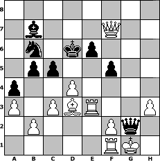 Partie-Notation im PGN-Format [Event "Spa"] [Site "www.mySchach.de"] [Date "2009.09.15"] [Round "1"] [White "Master1"] [Black "commander"] [ECO "D02"] [WhitemyELO "1294"] [BlackmyELO "1114"] [Result "0-1"] [TimeControl "10/2592000"] [WhiteDays "29"] [BlackDays "26"] [MySchachNr "59045"] 1. d4 d5 2. Nf3 e6 3. Nc3 Bb4 4. Bd2 Bxc3 5. Bxc3 Ne7 6. e3 O-O 7. Bd3 Re8 8. O-O Nd7 9. h3 a5 10. e4 dxe4 11. Bxe4 c6 12. a3 b5 13. Ng5 h6 14. Nf3 a4 15. Bb4 f5 16. Bd3 Nb6 17. Bxe7 Rxe7 18. c3 g5 19. Ne5 Bb7 20. Qh5 Qd5 21. Qxh6 c5 22. Qxg5+ Kf8 23. Ng6+ Kf7 24. Nxe7 Rg8 25. Qxg8+ Kxe7 26. Rae1 Kd7 27. Qf7+ Kd6 28. Re3 Qxg2# 0-1 Stellungs-Notation im FEN-Format 8/1b3Q2/1n1kp3/1pp2p2/p2P4/P1PBR2P/1P3Pq1/5RK1 - - - 0 29 Geschlagene Figuren Weiss: Geschlagene Figuren Schwarz: Klicken Sie auf eine geschlagene Figur um den gewünschten Zug darzustellen!