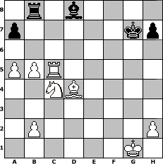Partie-Notation im PGN-Format [Event "Siebenschl"] [Site "www.mySchach.de"] [Date "2009.07.07"] [Round "1"] [White "espero"] [Black "RashimIbenRohal"] [Variant "Fischerrandom"] [SetUp "1"] [FEN "bqnbnrkr/pppppppp/8/8/8/8/PPPPPPPP/BQNBNRKR w KQkq - 0 1"] [WhitemyELO "1682"] [BlackmyELO "1522"] [Result "1-0"] [TimeControl "10/2592000"] [WhiteDays "79"] [BlackDays "64"] [MySchachNr "57227"] 1. b4 Nf6 2. c4 e6 3. d4 b6 4. Bc2 Nd6 5. Bd3 Qb7 6. f3 Be7 7. e4 Ndxe4 8. fxe4 Nxe4 9. Bxe4 Qxe4 10. Qxe4 Bxe4 11. Ncd3 f5 12. Rf2 c5 13. dxc5 bxc5 14. b5 d5 15. Ne5 Bd6 16. cxd5 exd5 17. N1f3 Bxf3 18. Rxf3 d4 19. Nc4 Bc7 20. O-O g6 21. g4 Kg7 22. gxf5 gxf5 23. Rxf5 Rxf5 24. Rxf5 Bb6 25. a4 Rc8 26. a5 Bd8 27. Rxc5 Rb8 28. Bxd4+ 1-0 Stellungs-Notation im FEN-Format 1r1b4/p5kp/8/PPR5/2NB4/8/1P5P/6K1 - - - 0 28 Geschlagene Figuren Weiss: Geschlagene Figuren Schwarz: Klicken Sie auf eine geschlagene Figur um den gewünschten Zug darzustellen!