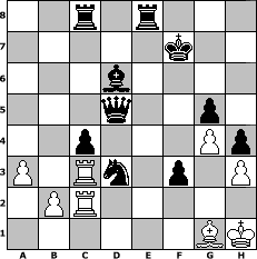 Partie-Notation im PGN-Format [Event "Zu Gast bei Freunden"] [Site "www.mySchach.de"] [Date "2006.06.16"] [Round "1"] [White "Falcor"] [Black "Fussel"] [ECO "D10"] [WhitemyELO "1356"] [BlackmyELO "1433"] [Result "0-1"] [TimeControl "10/864000"] [WhiteDays "32"] [BlackDays "11"] [MySchachNr "26281"] 1. d4 d5 2. c4 c6 3. Nc3 Bf5 4. Nf3 e6 5. g3 Be7 6. Bg2 Na6 7. a3 Nf6 8. O-O dxc4 9. Bf4 Nd5 10. Nxd5 cxd5 11. Qa4+ Kf8 12. Rfe1 f6 13. Nh4 Be4 14. Bxe4 dxe4 15. Qxc4 Qd7 16. Red1 g5 17. Ng2 b5 18. Be3 bxc4 19. Rac1 Rc8 20. f3 exf3 21. exf3 Kf7 22. Bf2 f5 23. Ne3 Qb5 24. Rc2 f4 25. Rdc1 fxe3 26. Bxe3 Rhg8 27. Kg2 h5 28. Kg1 h4 29. g4 Bd6 30. h3 Qb3 31. Re2 e5 32. d5 Rge8 33. Kf2 Nc5 34. Rc3 Nd3+ 35. Kg2 Qa4 36. Rd2 Nf4+ 37. Kh2 Qa5 38. Rdc2 Qxd5 39. Bxa7 Nd3 40. Bg1 e4+ 41. Kh1 exf3 0-1 Stellungs-Notation im FEN-Format 2r1r3/5k2/3b4/3q2p1/2p3Pp/P1Rn1p1P/1PR5/6BK - - - 0 42 Geschlagene Figuren Weiss: Geschlagene Figuren Schwarz: Klicken Sie auf eine geschlagene Figur um den gewünschten Zug darzustellen!