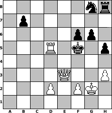 Partie-Notation im PGN-Format [Event "Schach in den Mai"] [Site "www.mySchach.de"] [Date "2008.04.26"] [Round "1"] [White "Steppenwolf"] [Black "Hobbykegler"] [ECO "D06"] [WhitemyELO "1236"] [BlackmyELO "1145"] [Result "1-0"] [TimeControl "10/864000"] [WhiteDays "43"] [BlackDays "33"] [MySchachNr "44508"] 1. d4 d5 2. c4 Be6 3. Nf3 g6 4. Nc3 Bh6 5. Bxh6 Nxh6 6. e4 dxc4 7. d5 Bg4 8. Bxc4 Qd6 9. O-O Nd7 10. h3 Bxf3 11. Qxf3 Ne5 12. Qe2 O-O-O 13. Nb5 Qc5 14. a3 a5 15. b4 axb4 16. axb4 Qxb4 17. g4 Nxc4 18. Rfb1 Qc5 19. g5 Ng8 20. Ra2 c6 21. Nc3 cxd5 22. Qg4+ Kb8 23. Rba1 Nb6 24. Na4 Nxa4 25. Rxa4 Kc7 26. Ra8 Rxa8 27. Rxa8 Qc1+ 28. Kg2 h5 29. Qc8+ Kd6 30. Qxc1 f6 31. gxf6 exf6 32. Qf4+ Kc5 33. Qc7+ Kd4 34. exd5 Kxd5 35. Rd8+ Ke4 36. Qc4+ Ke5 37. Qd5+ Kf4 38. Qf3+ Kg5 39. Qe3+ Kf5 40. Rd5# 1-0 Stellungs-Notation im FEN-Format 6nr/1p6/5pp1/3R1k1p/8/4Q2P/3P1PK1/8 - - - 11 40 Geschlagene Figuren Weiss: Geschlagene Figuren Schwarz: Klicken Sie auf eine geschlagene Figur um den gewünschten Zug darzustellen!