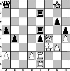 | Partie-Notation im PGN-Format [Event "Wrixum - Open die XIII"] [Site "www.mySchach.de"] [Date "2016.09.28"] [Round "1"] [White "alibengali"] [Black "reisinger"] [ECO "D24"] [WhitemyELO "1637"] [BlackmyELO "1474"] [Result "0-1"] [TimeControl "10/2592000"] [WhiteDays "30"] [BlackDays "30"] [MySchachNr "105076"] 1. d4 d5 2. c4 dxc4 3. Nf3 Nf6 4. Nc3 Bg4 5. Ne5 Be6 6. e4 c6 7. Bxc4 Bxc4 8. Nxc4 b5 9. Ne5 b4 10. Qb3 e6 11. Ne2 a5 12. Qf3 Nbd7 13. Nxc6 Qb6 14. d5 Bc5 15. Be3 exd5 16. exd5 Bxe3 17. fxe3 Qc5 18. e4 O-O 19. Rc1 Qd6 20. O-O Rae8 21. Ng3 Ne5 22. Nxe5 Qxe5 23. Rce1 Qxb2 24. Rf2 Qe5 25. Qf5 Nxd5 26. Rfe2 Qd4+ 27. Kh1 Nc3 28. Re3 Re5 29. Qg4 g6 30. h4 h5 31. Qf3 Rfe8 32. Ne2 Nxe2 33. R3xe2 Kg7 34. g3 Rc8 35. Rf1 Rc7 36. Qf6+ Kg8 37. Qf4 Rce7 38. Rfe1 Qc4 39. Kg2 Qc6 40. Rc1 Qa8 41. Rce1 f5 42. Kf3 fxe4+ 0-1 Stellungs-Notation im FEN-Format q5k1/4r3/6p1/p3r2p/1p2pQ1P/5KP1/P2PR3/4R3 - - - 0 43 Geschlagene Figuren Weiss:                              Geschlagene Figuren Schwarz:                               Klicken Sie auf eine geschlagene Figur um den gewünschten Zug darzustellen!