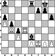 Partie-Notation im PGN-Format [Event "Schach dem Osterhasen IV"] [Site "www.mySchach.de"] [Date "2015.03.29"] [Round "1"] [White "Schefsche"] [Black "Caligula"] [ECO "C21"] [WhitemyELO "1470"] [BlackmyELO "1385"] [Result "0-1"] [TimeControl "10/2592000"] [WhiteDays "108"] [BlackDays "094"] [MySchachNr "98730"] 1. e4 e5 2. d4 exd4 3. Nf3 c5 4. Bc4 Nc6 5. Ng5 Ne5 6. Bd5 h6 7. Nf3 Nf6 8. Nxe5 Nxd5 9. Qf3 Nf6 10. Nd2 d6 11. Nec4 b5 12. e5 Bg4 13. Qf4 dxe5 14. Qxe5+ Be7 15. Nd6+ Qxd6 16. Qxd6 Bxd6 17. O-O O-O 18. a4 a6 19. a5 Rfe8 20. f3 Bf5 21. Ne4 Nxe4 22. fxe4 Bxe4 23. c3 dxc3 24. bxc3 c4 25. Ba3 Be5 26. Bb4 Rad8 27. Rae1 Bf6 28. Rf4 Ba8 29. Rxe8+ Rxe8 30. Kf2 Bg5 31. Rd4 Be3+ 0-1 Stellungs-Notation im FEN-Format b3r1k1/5pp1/p6p/Pp6/1BpR4/2P1b3/4PKPP/8 - - - 4 32 Geschlagene Figuren Weiss: Geschlagene Figuren Schwarz: Klicken Sie auf eine geschlagene Figur um den gewünschten Zug darzustellen!